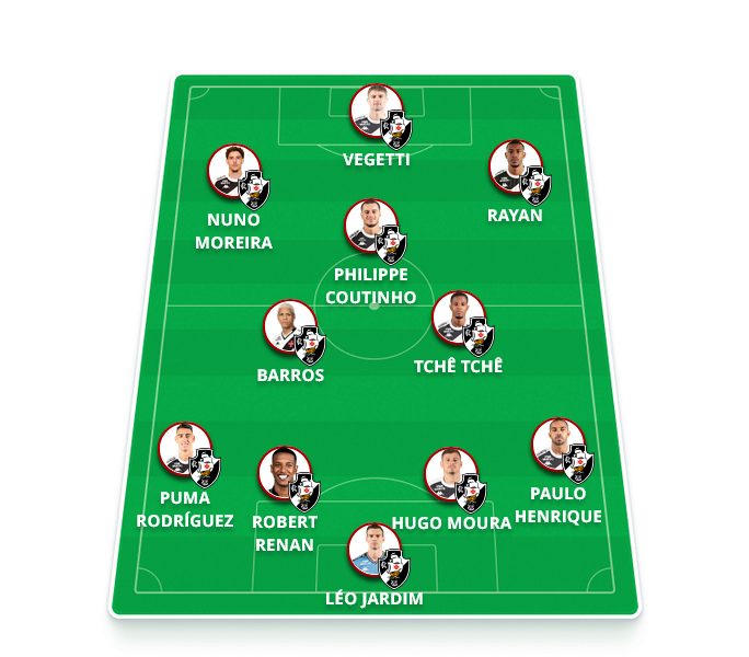 A provável escalação do Vasco: Léo Jardim, Paulo Henrique, Hugo Moura, Robert Renan, Puma Rodríguez, Barros, Tchê Tchê; Coutinho, Nuno Moreira, Rayan e Vegetti.