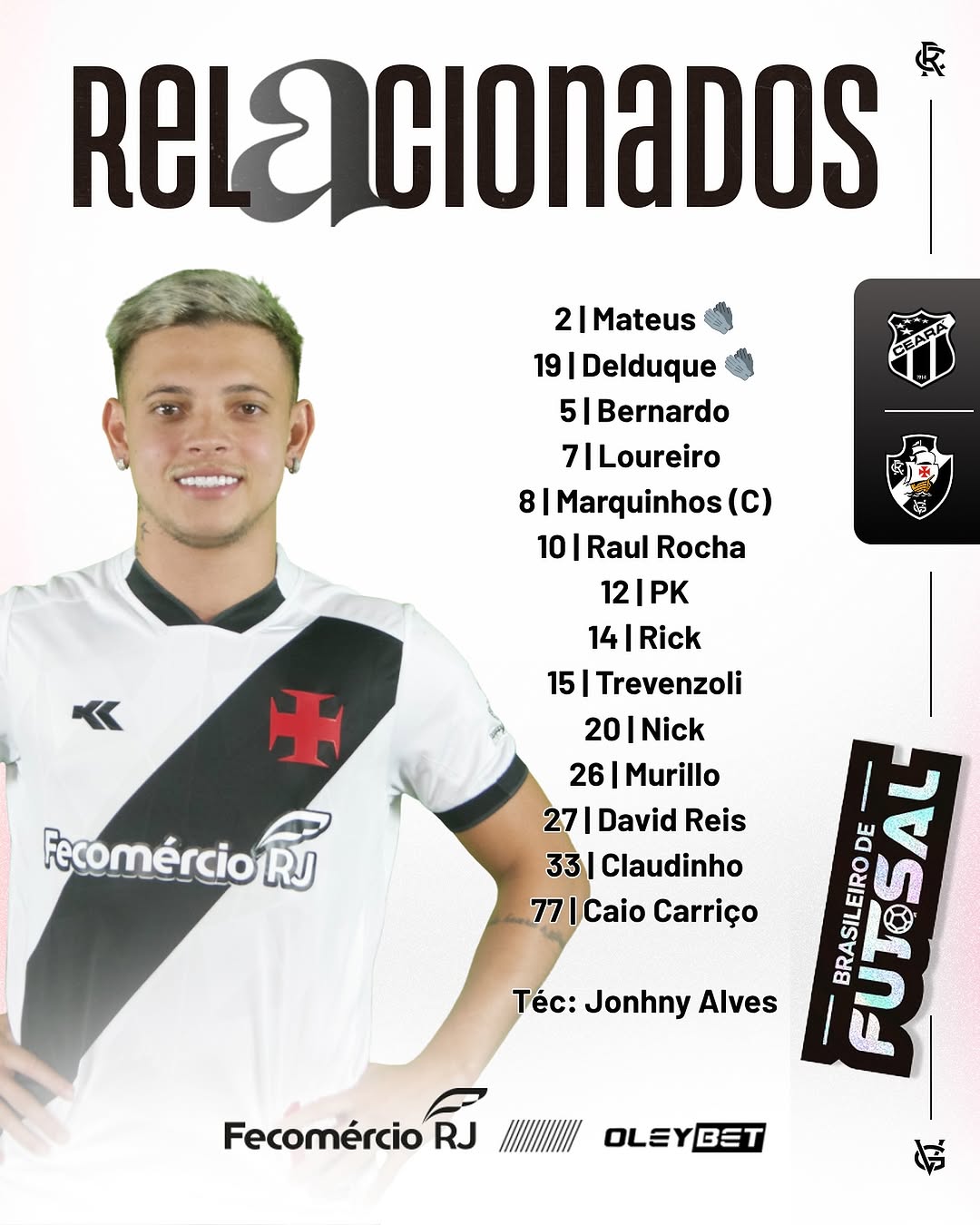Esses são os atletas do Vasco que estarão à disposição do treinador Jonhny Alves para a partida de daqui a pouco, às 11h, contra o Ceará, valendo vaga nas quartas de final do Brasileiro de futsal! 🧢📋