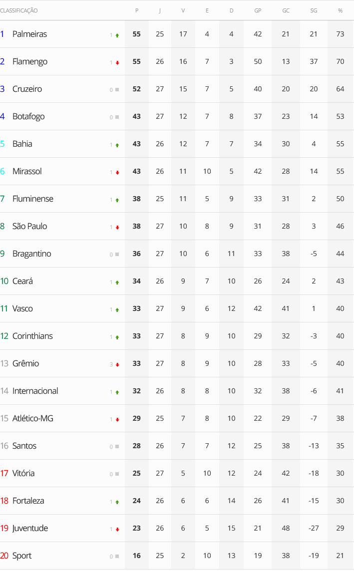 Terminada a 27ª rodada do Campeonato Brasileiro, o Vasco, que venceu o Vitória por 4 a 3, está na 11ª colocação.