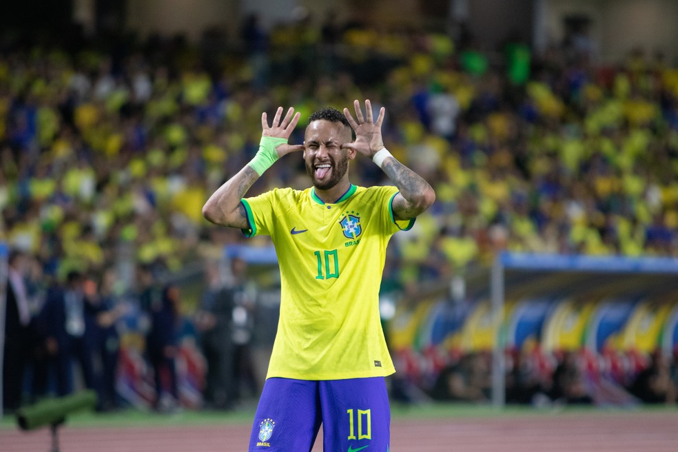 Neymar comemora gol durante partida das Eliminatórias da Copa do Mundo — Foto: Fernando Torres/AGIF