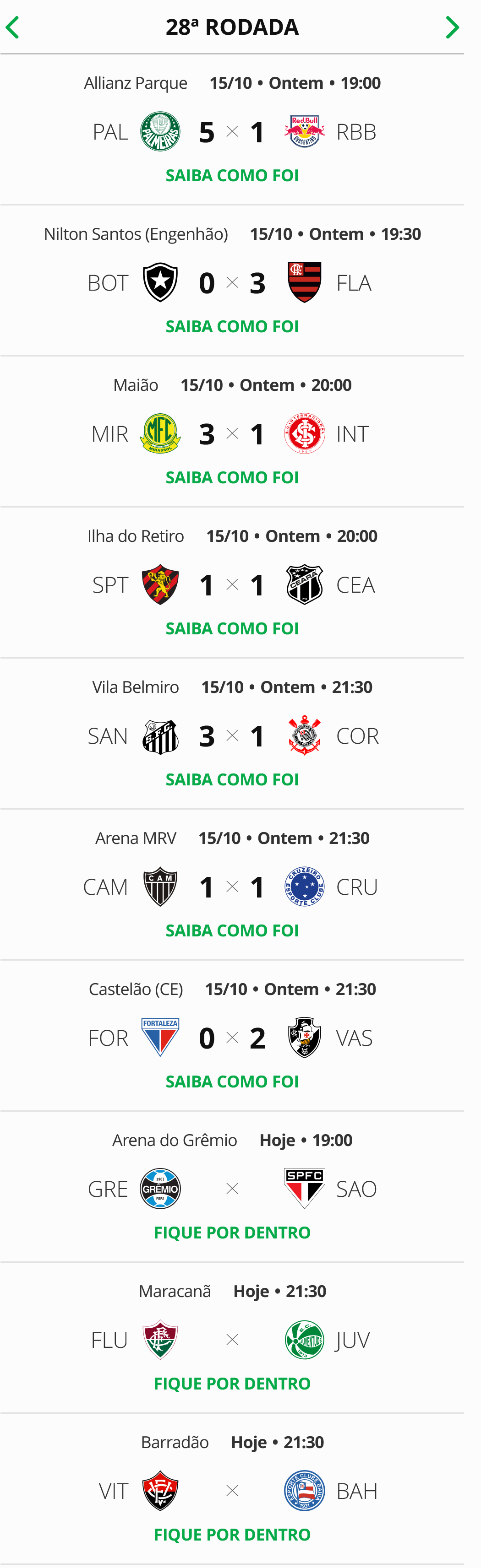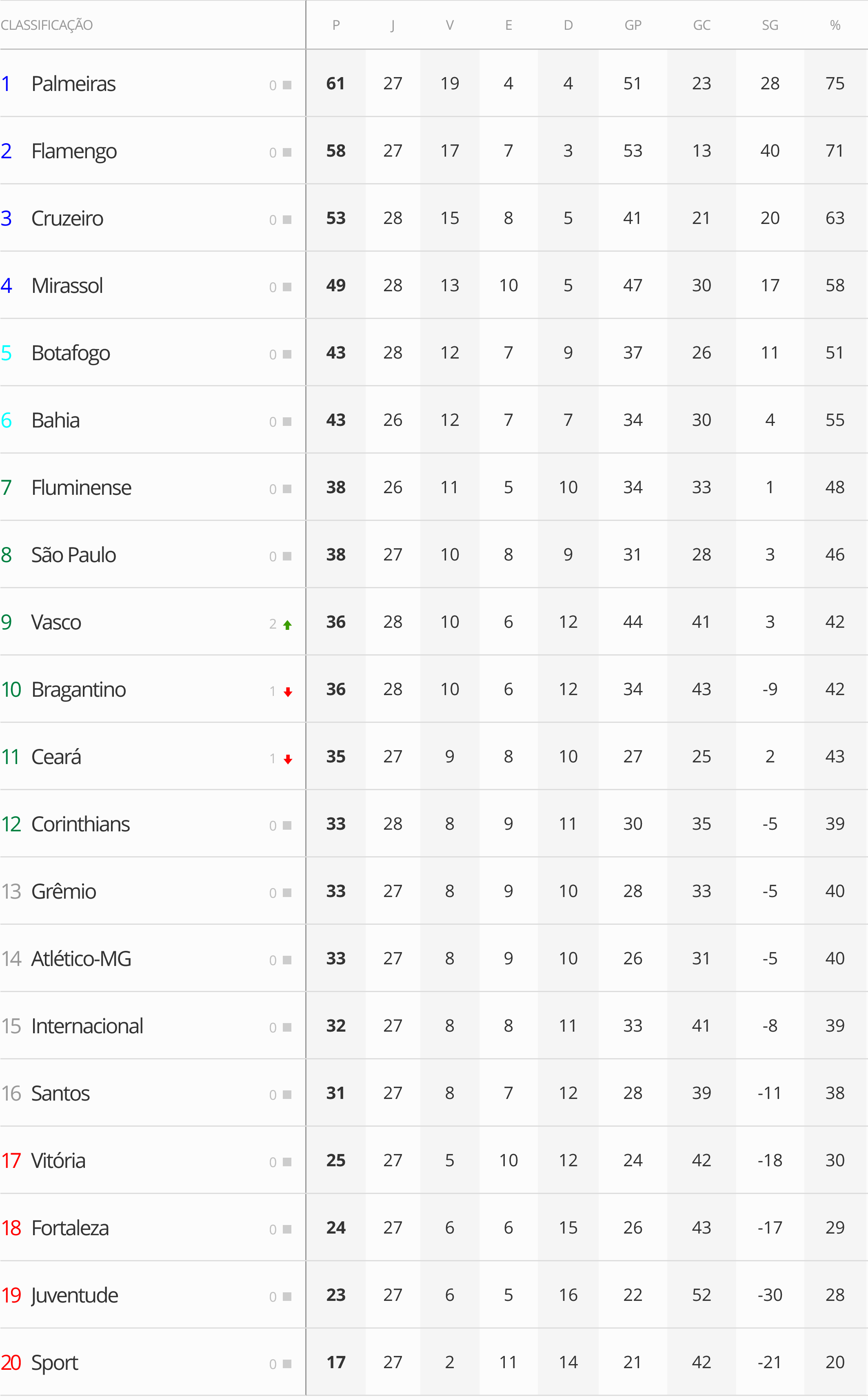 Sete jogos abriram a 28ª rodada do Campeonato Brasileiro. O Vasco, que venceu o Fortaleza fora de casa por 2 a 0, pulou para a 9ª colocação.