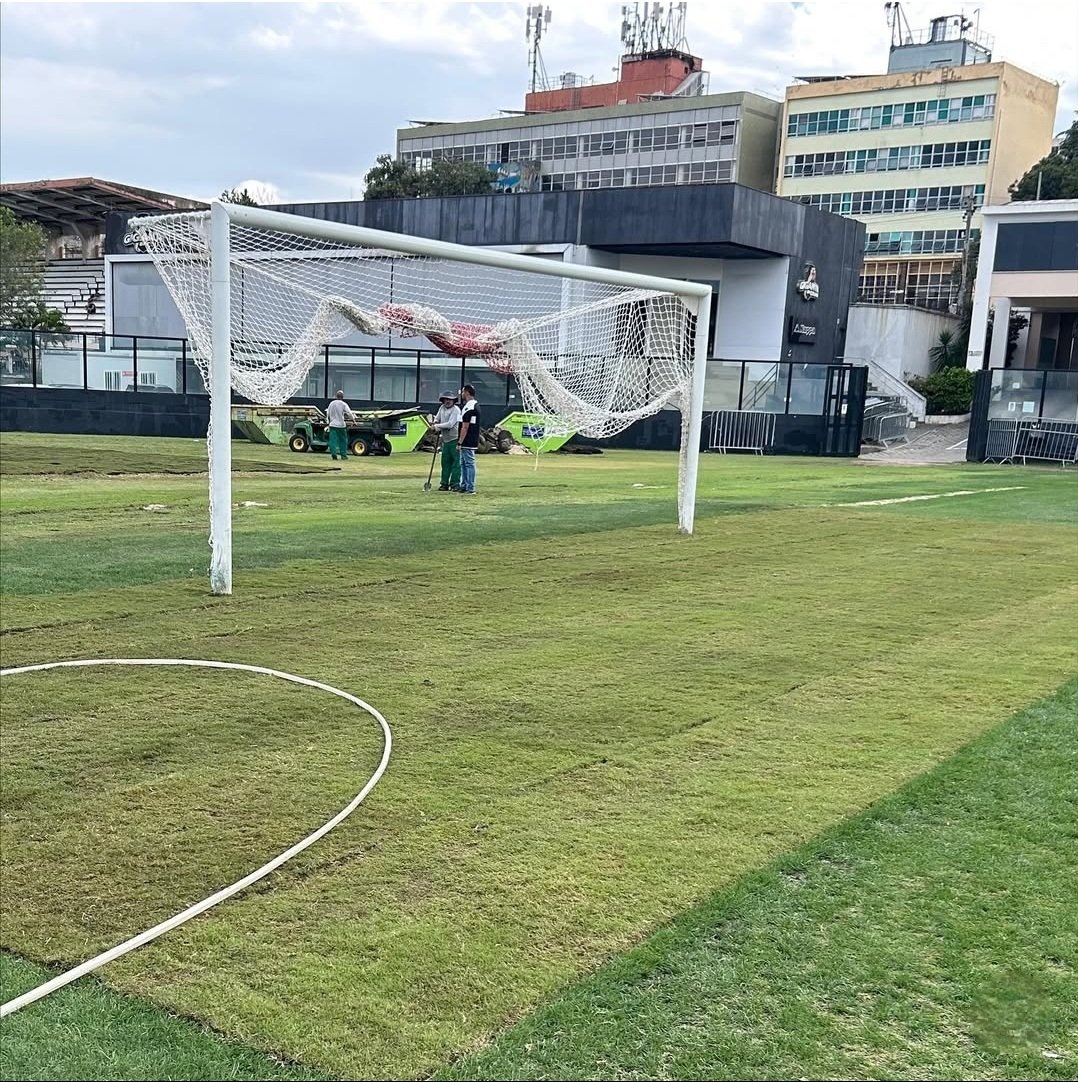 O campo segue em tratamento para corrigir as manchas causadas pela mutação da grama. As pequenas áreas já foram replantadas e o processo de recuperação continua.