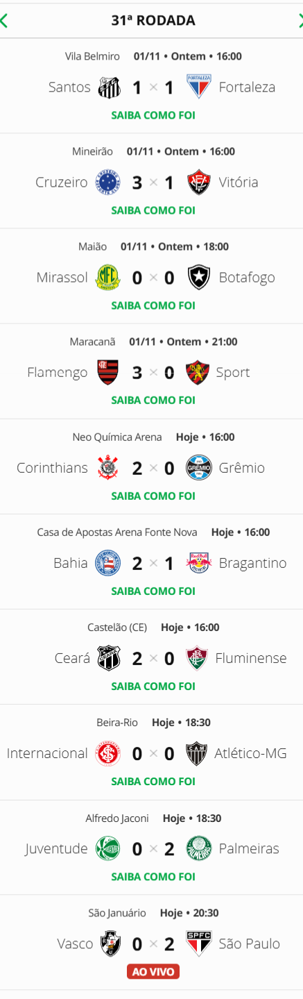 Terminada a 31ª rodada do Campeonato Brasileiro, o Vasco, que perdeu para o São Paulo por 2 a 0, caiu da 8ª para a 9ª colocação.