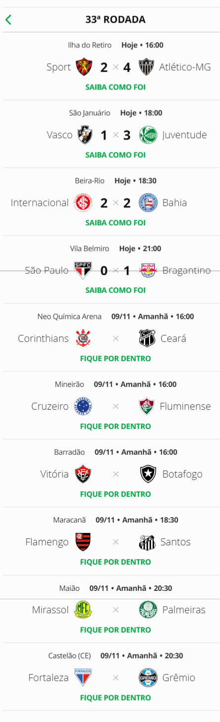 Quatro jogos abriram a 33ª rodada do Campeonato Brasileiro neste sábado. O Vasco, que perdeu para o Juventude por 3 a 1 em São Januário, caiu do 9º para o 10º lugar. A distância para o G7 está em 8 pontos.