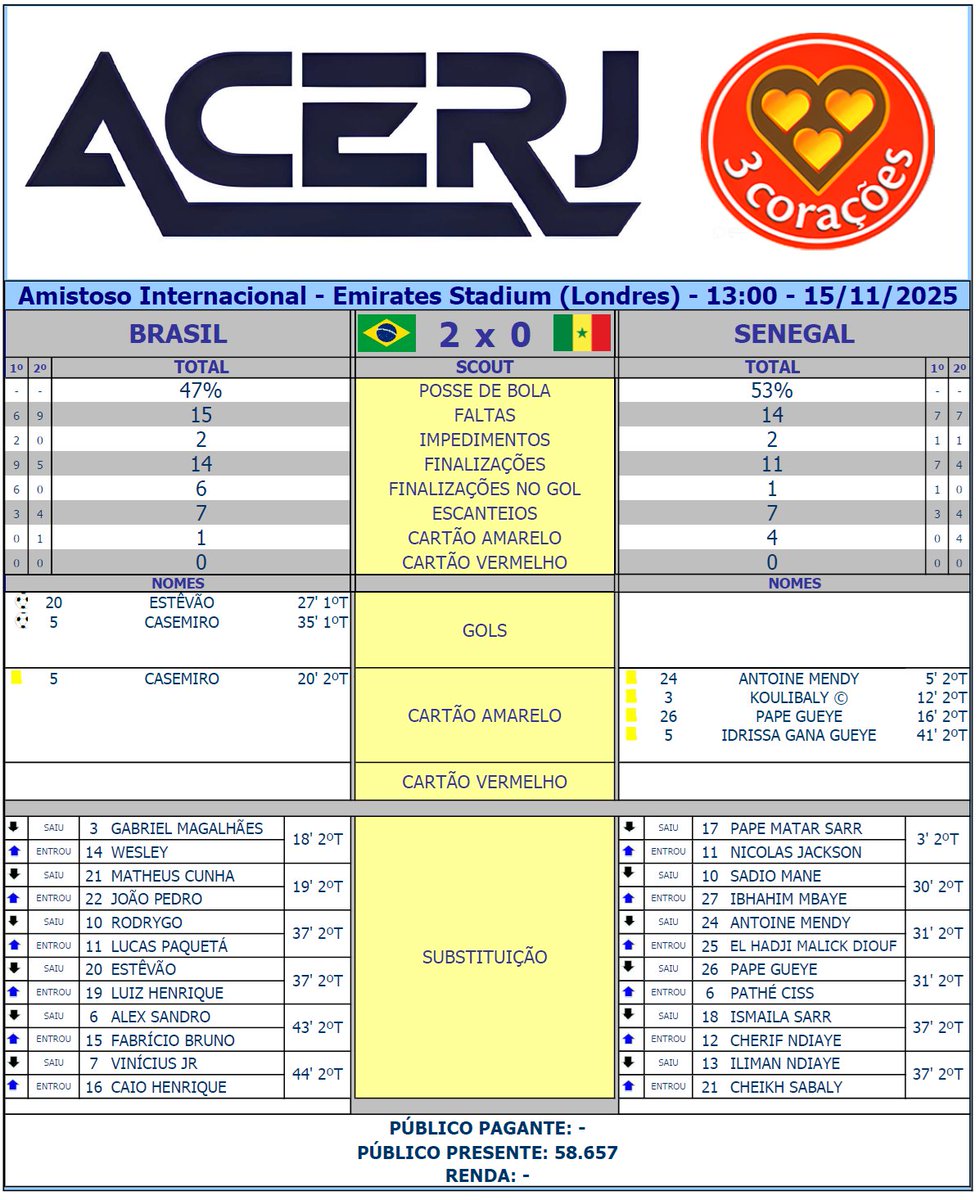 Scout Final de Brasil e Senegal em jogo amistoso de preparação para a Copa do Mundo de 2026 no Emirates Stadium em Londres #Acerjinforma #BRAxSEN @CBF_Futebol @GaindeYi