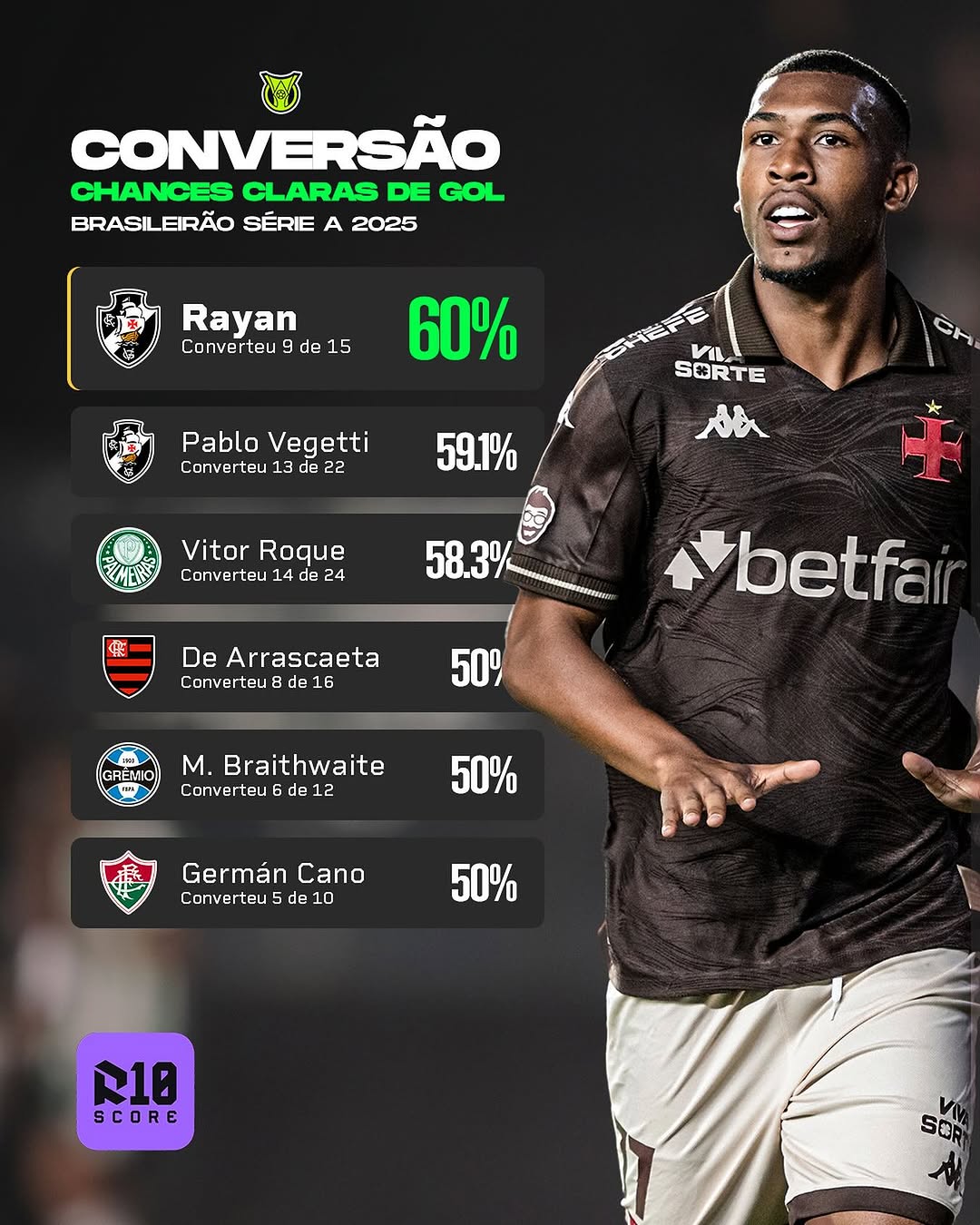NÃO PERDOAM! Estes são os jogadores com as maiores % de conversão de chances claras no Brasileirão 2025. ⚽️🇧🇷
