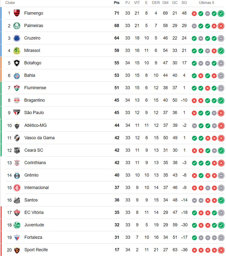 O jogo Botafogo 3 x 2 Sport abriu, nesta 3ª-feira, a 34ª rodada do Campeonato Brasileiro. O Vasco, que enfrenta o Grêmio nesta 4ª-feira, às 21h30, em Porto Alegre, segue na 10ª colocação.