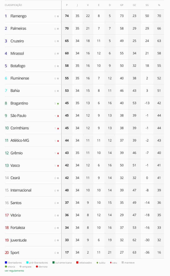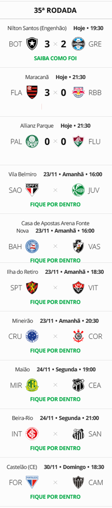 Três jogos abriram, neste sábado, a rodada de número 35 do Campeonato Brasileiro. O Vasco segue na 13ª posição. O Gigante da Colina enfrenta o Bahia neste domingo, às 16h, na Fonte Nova e, se vencer, ganhará no mínimo 2 posições, ultrapassando Grêmio e Red Bull Bragantino.