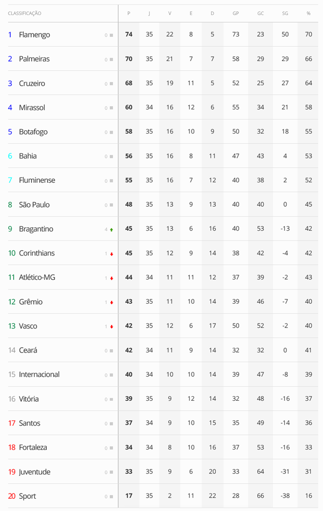 Terminados os jogos de domingo da 35ª rodada do Campeonato Brasileiro, o Vasco, que foi derrotado pelo Bahia por 1 a 0, segue na 13ª colocação. O Gigante da Colina, no entanto, ainda pode perder mais duas posições nesta 2ª-feira.