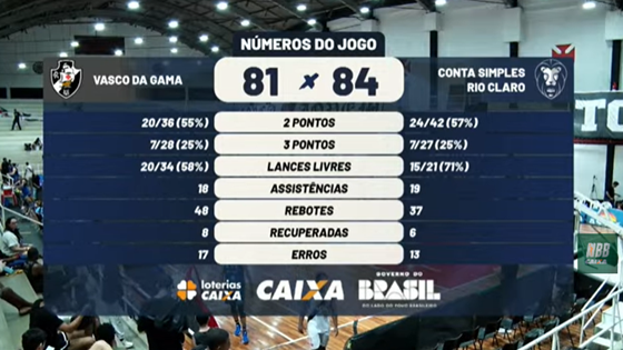 Motivado, o Cruz-Maltino seguiu lutando muito até o término da partida. Só que Dos Anjos matou bola tripla a 26 segundos do término, esfriando a reação: 81 a 77. O Vasco não desistiu do jogo, chegando a diminuir para 83 a 81 numa cesta de Mathias. Contudo, o Rio Claro controlou os instantes derradeiros da partida, confirmando a vitória por 84 a 81.