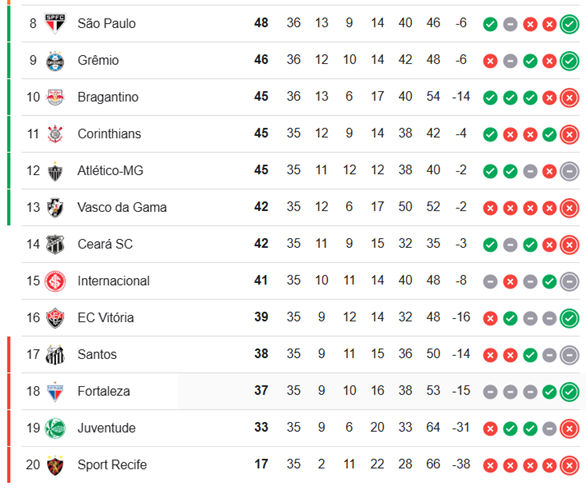 A 36ª rodada do Campeonato Brasileiro seguimento com um jogo nesta 4ª-feira: o Fluminense goleou o São Paulo por 6 a 0 no Maracanã. O Vasco, que segue em 13º lugar, enfrenta o Internacional nesta 6ª-feira, às 19h30, em São Januário.