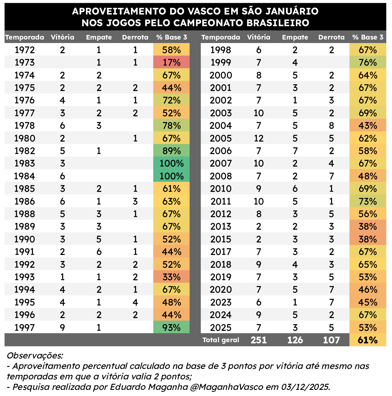 Confira o aproveitamento do Vasco em São Januário no Campeonato Brasileiro desde 1972