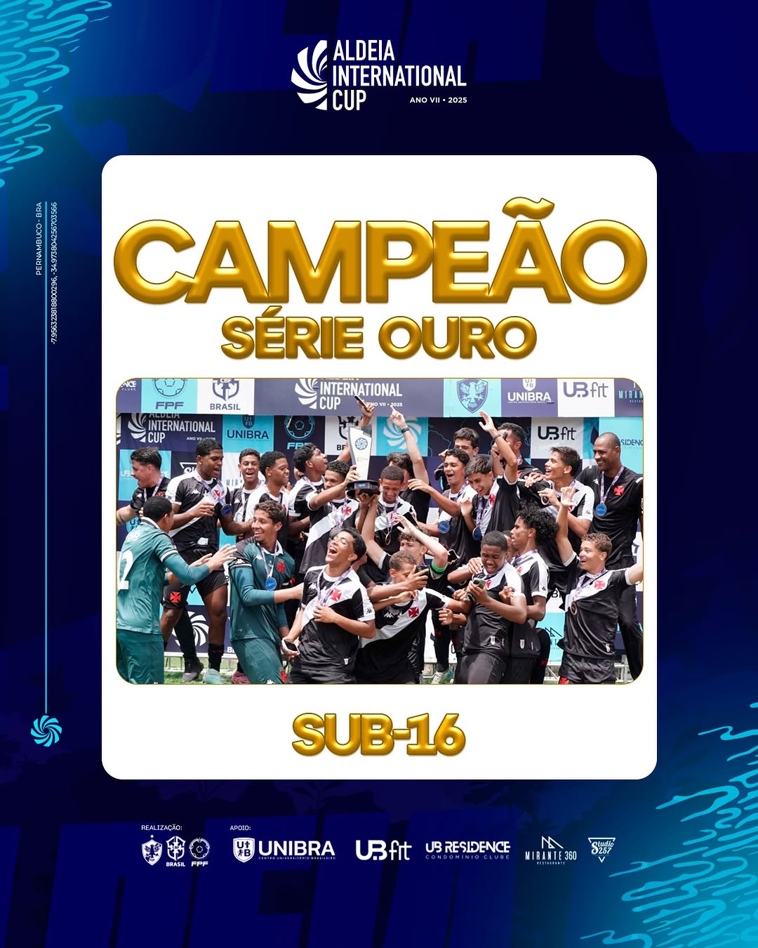 O Vasco acaba de conquistar o título da Série Ouro da Aldeia International Cup Sub-16, em Pernambuco. Na final, o time venceu o Santos por 2 a 0, com gols de Allan Santos e Yuri Domingues. Conquista inédita para o clube. A equipe foi campeã com 100% de aproveitamento.