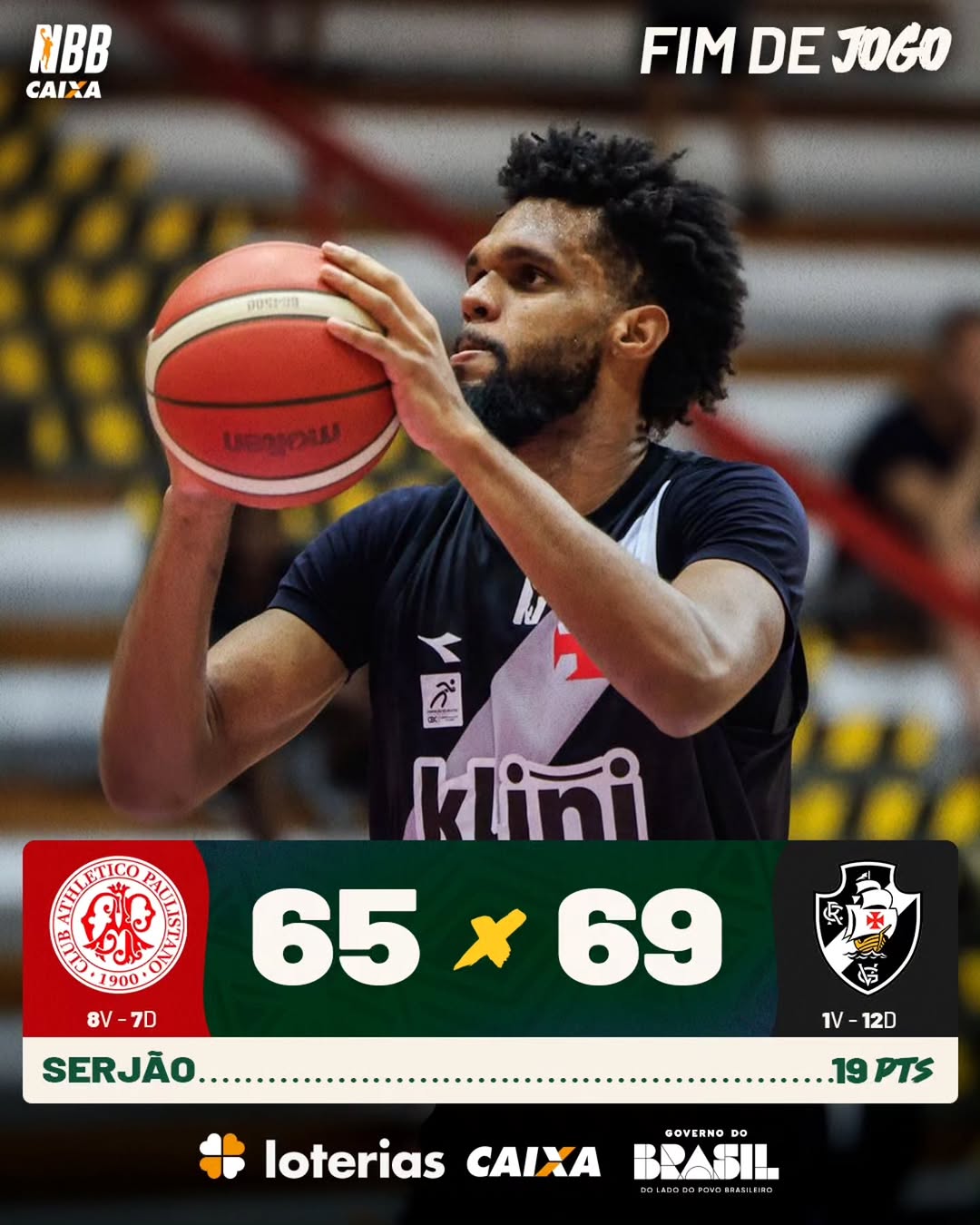 Após 12 derrotas seguidas, o Vasco obteve na noite desta 5ª-feira a sua primeira vitória no NBB 2025/2026. O Gigante da Colina derrotou o Paulistano por 69 a 65 em São Paulo.