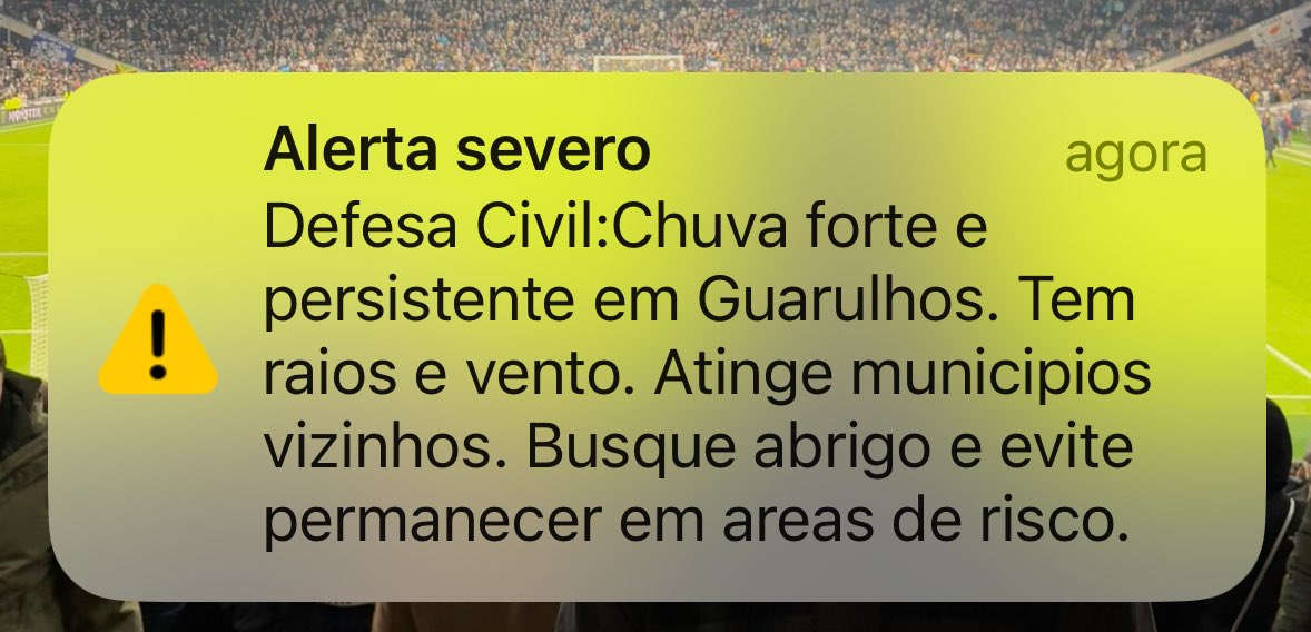 O canal @AVascainos já marca presença na porta do Hotel onde a delegação do Vasco ficará concentrada para o 1° jogo da decisão da Copa do Brasil. Muita chuva aqui em Guarulhos. A Defesa Civil Municipal emitiu um alerta, que chegou em todos os celulares que estão na região.