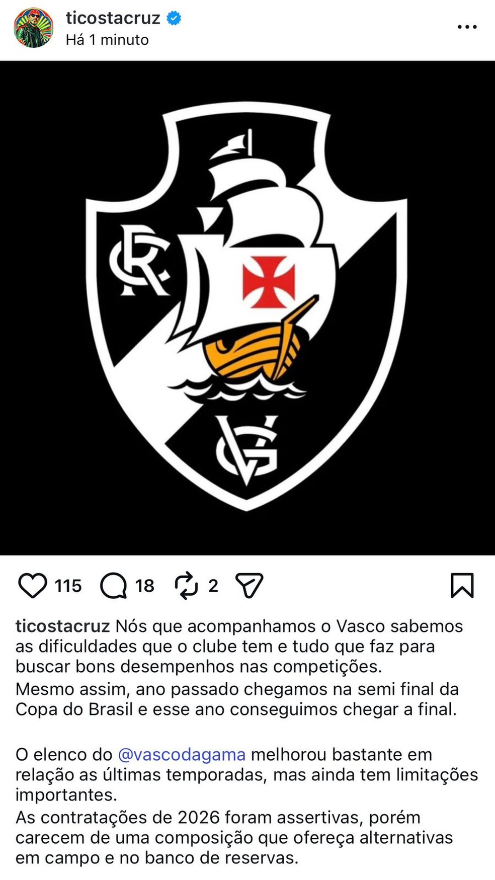 "O Vasco voltará a ter seus dias de glória", escreveu o vocalista do Detonautas.