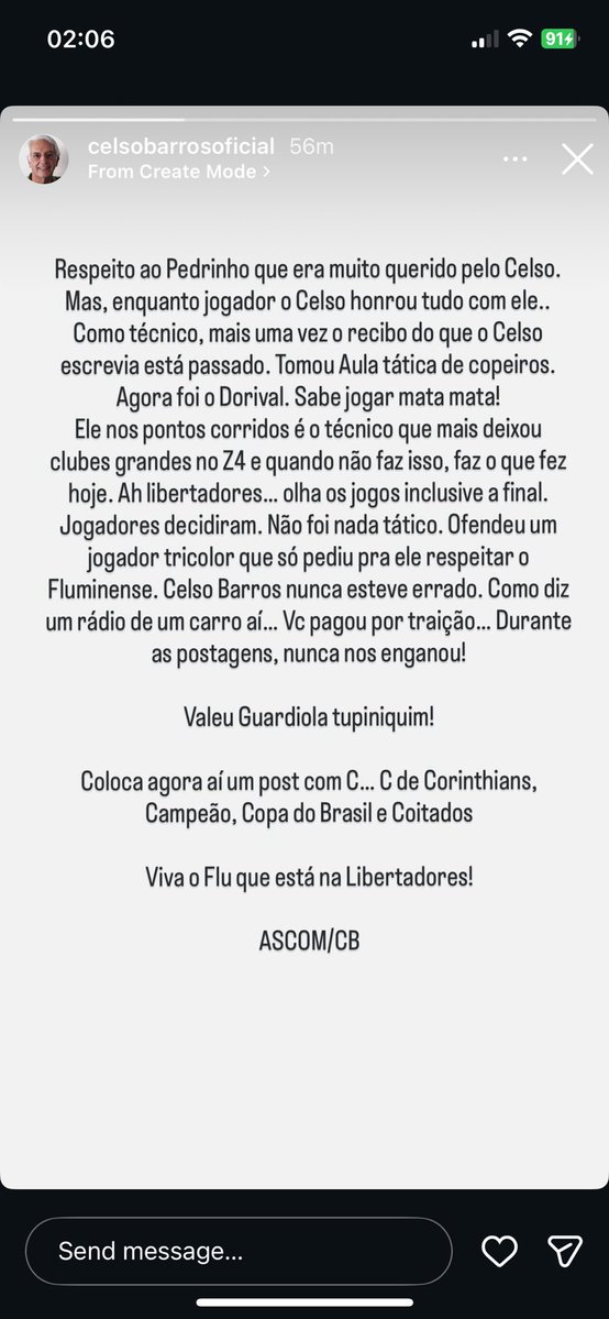Aí, você abre o Instagram e o perfil do recém-falecido Celso Barros, que já foi dirigente do Fluminense e concorria à eleição presidencial, ataca Pedrinho e Fernando Diniz.