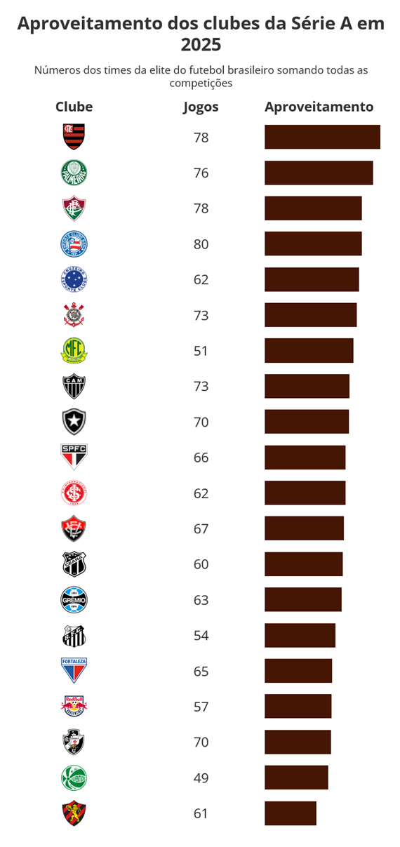 Qual time da Série A teve o melhor aproveitamento em 2025? E o pior? O Gato Mestre te mostra abaixo um ranking com o desempenho dos times da elite do futebol brasileiro somando todas as competições da temporada. Finalista da Copa do Brasil, o Vasco foi o terceiro pior da lista, que tem Flamengo e Palmeiras no topo.