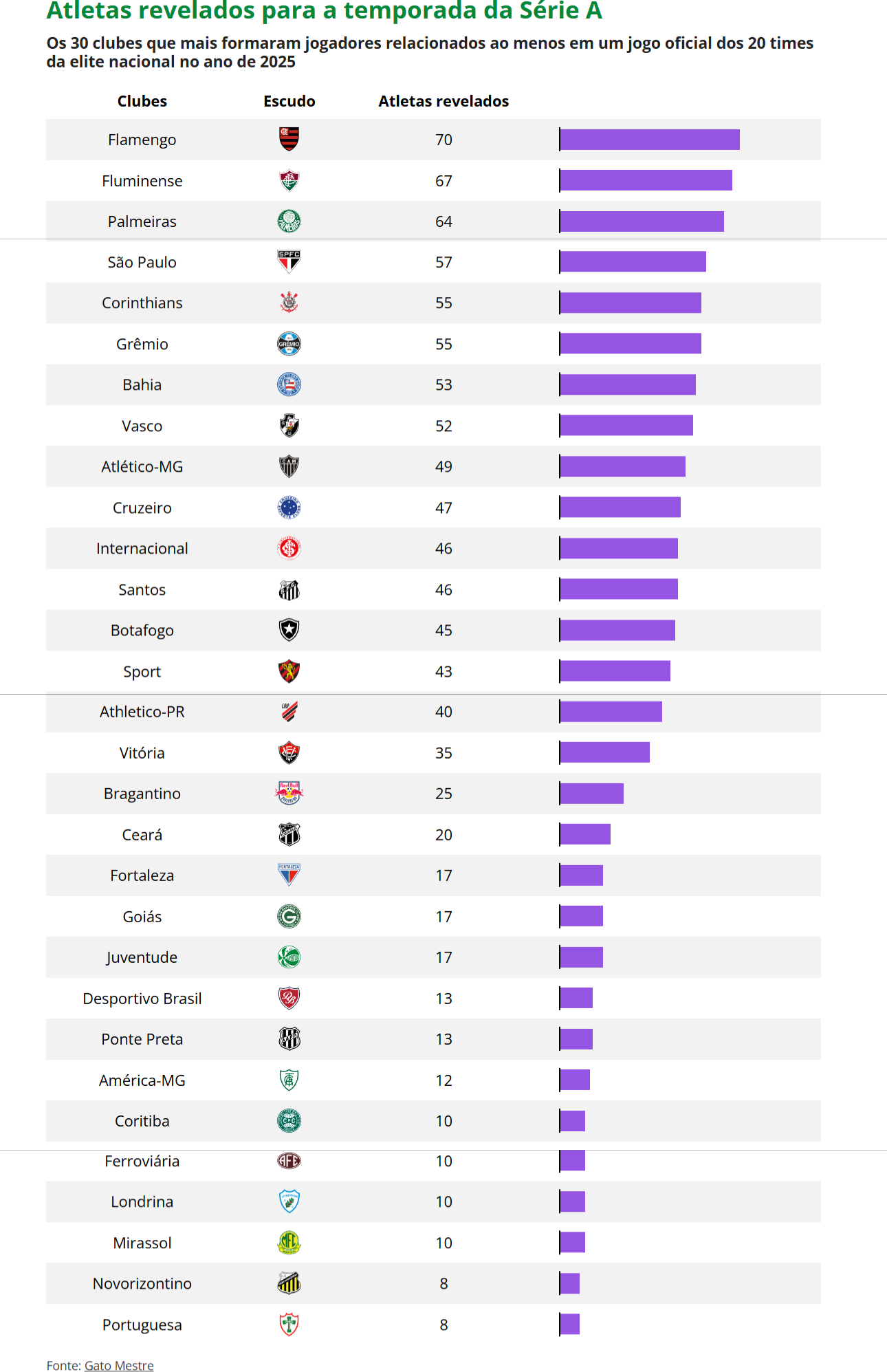 O uso de atletas jovens no início do ano, enquanto a equipe principal fazia a pré-temporada nos Estados Unidos, ajudou nessa construção, mas a força de seu trabalho de formação vai além: as categorias de base do Flamengo são as que mais revelaram jogadores quando considerados os relacionados em pelo menos um jogo de todos os clubes da Série A nesta temporada. Um atleta que tenha atuado em mais de um clube em 2025 só foi contado uma vez.