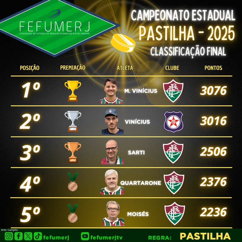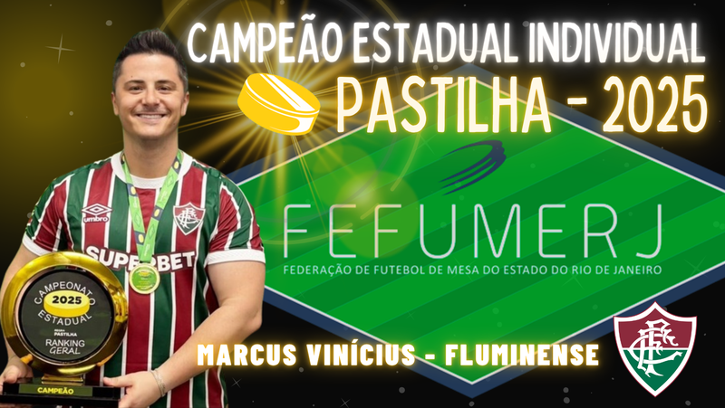 O Campeonato Estadual Individual de Pastilha 2025 – FEFUMERJ chegou ao fim! Depois de quatro etapas, o atleta Marcus Vinícius, do Fluminense F.C., leva pela primeira vez o título individual da regra para o tradicionalíssimo Tricolor das Laranjeiras! Porém, esse é o sexto título individual de Marquinhos na Pastilha, consolidando-o como o maior campeão da história na regra no RJ.