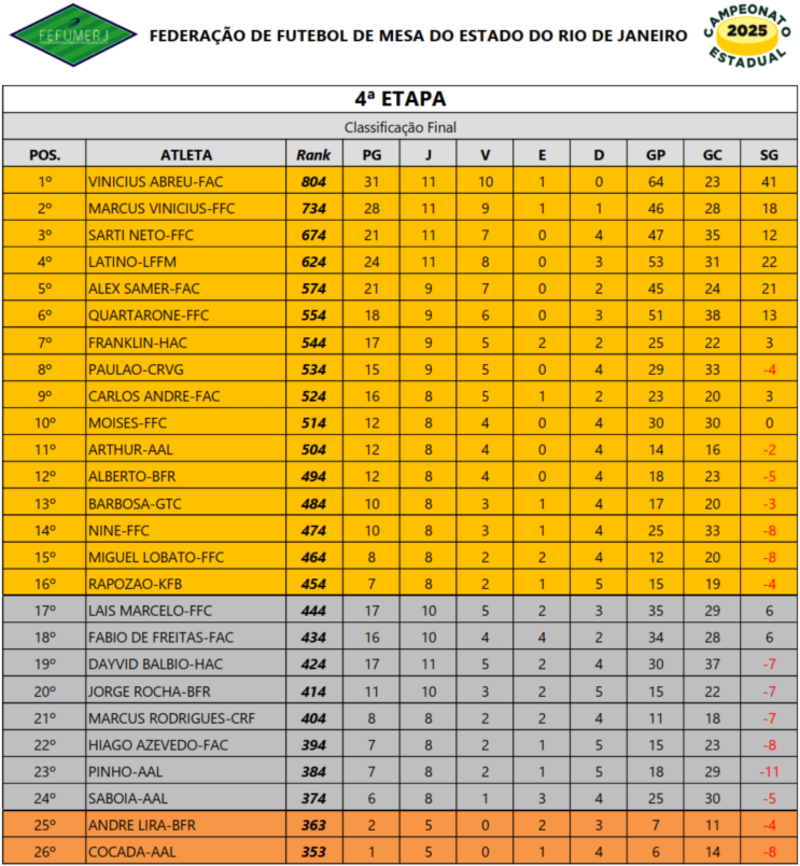 A quarta e última etapa foi disputada no domingo, dia 02/11/2025, na sede do futebol de mesa do Botafogo de Futebol e Regatas, na Rua Riachuelo 373, no Rio de Janeiro. Vinte e seis atletas representaram dez clubes: Botafogo, Flamengo, Fluminense, Vasco da Gama, Friburguense, Liga Fonte, Humaitá, AAL, Grajaú Tênis e Kamikaze.