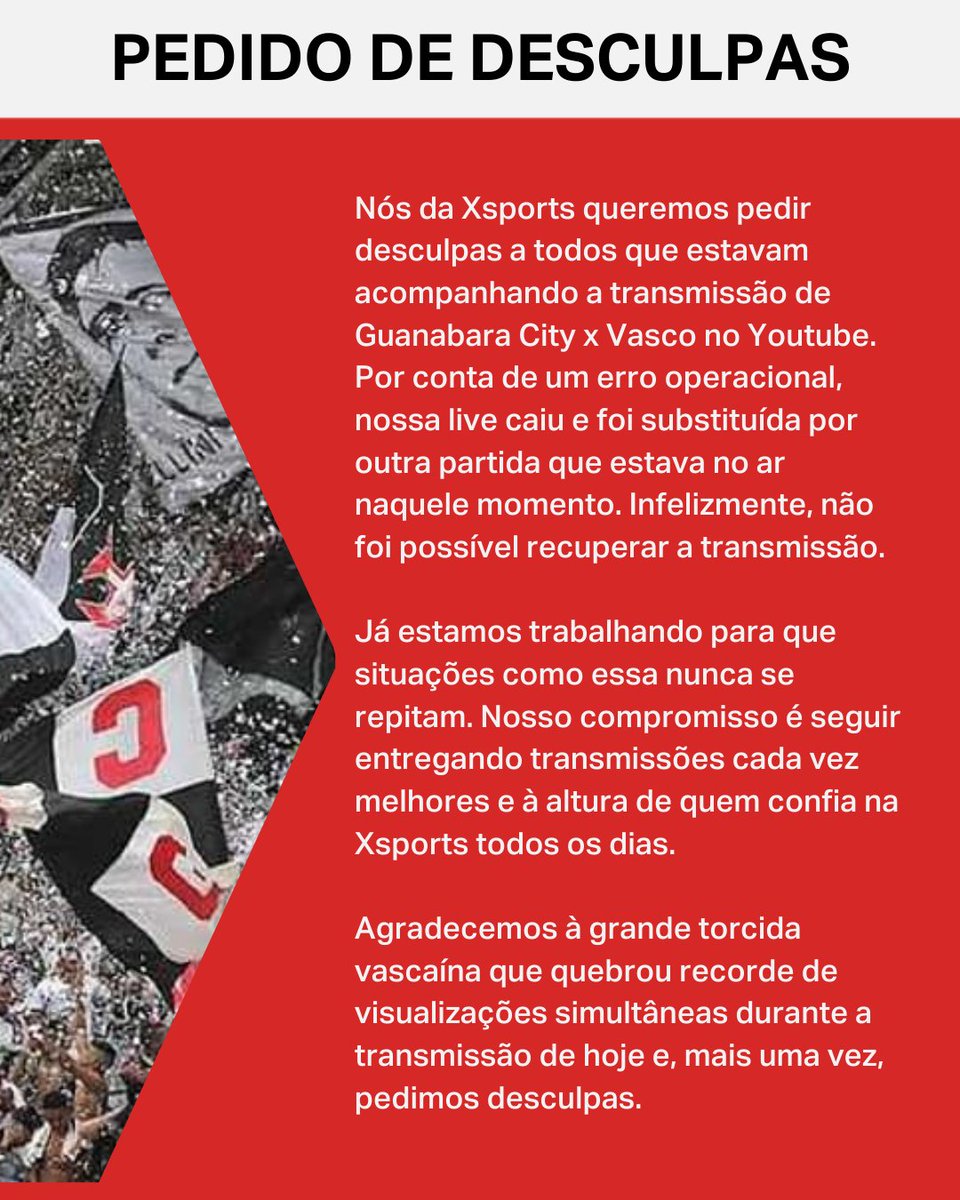 Agradecemos à grande torcida vascaína que quebrou recorde de visualizações simultâneas durante a transmissão de hoje e, mais uma vez, pedimos desculpas.
