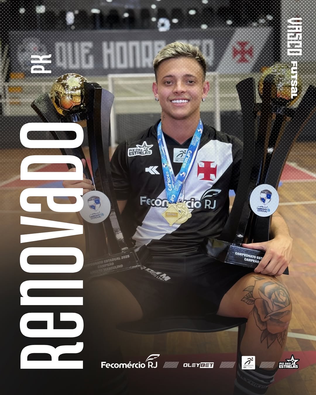 O craque do Gigante da Colina, campeão carioca e estadual, está renovado e segue com a equipe adulta do Vasco Futsal.