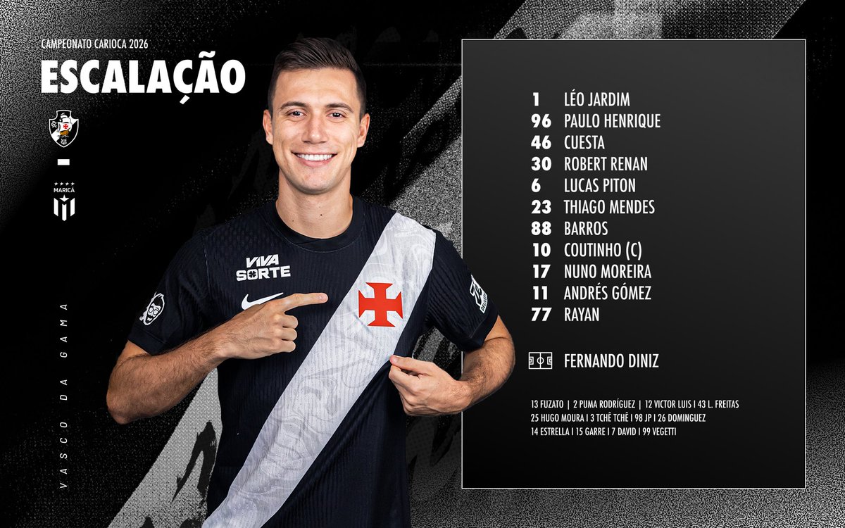 Confira a escalação do Vasco para o jogo contra o Maricá
