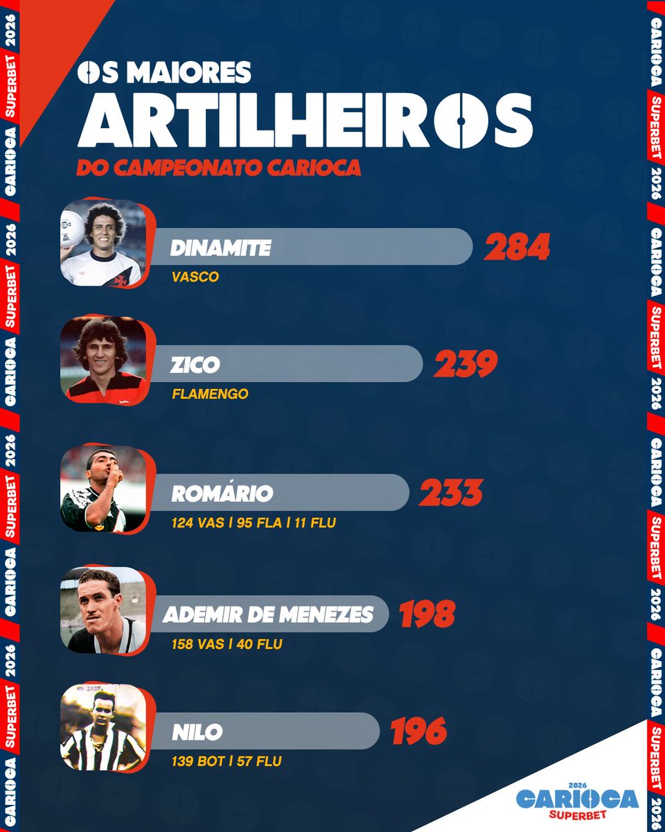 Dinamite é o maior artilheiro da história do Carioca; Romário e Ademir aparecem no top 5