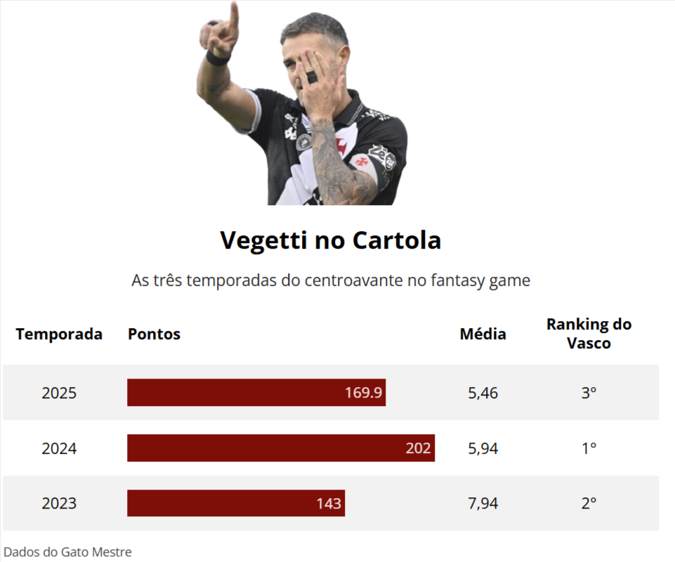 Pablo Vegetti não é mais jogador do Vasco, e o Gato Mestre aparece para mostrar os números do atacante no Cartola. O camisa 99 ficou entre os três melhores do Cruzmaltino em todas as temporadas que atuou no fantasy game. Confira os números completos abaixo.