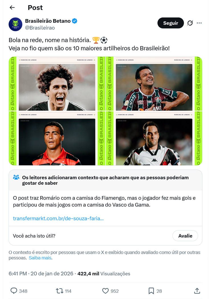 Perfil do Brasileirão no X põe Romário com a camisa do Urubu em post sobre artilheiros e leva Nota da Comunidade