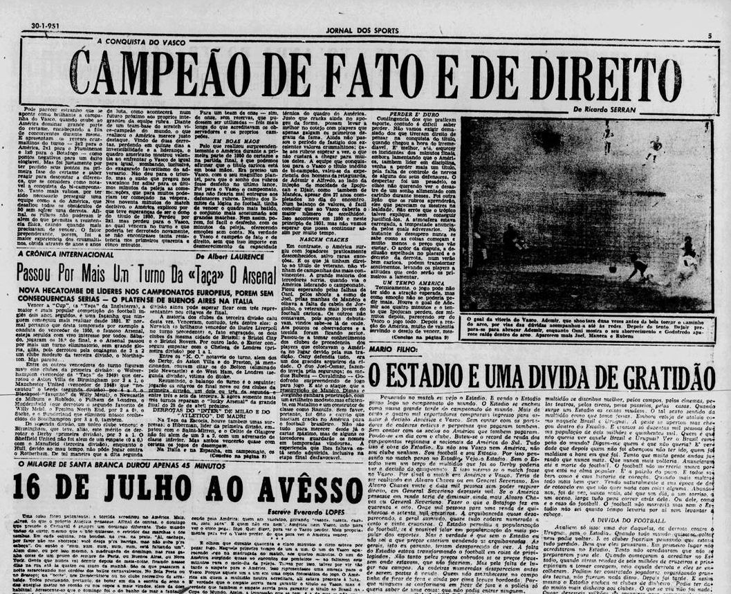 Há 75 anos, em 28 de janeiro de 1951, o Vasco derrotava o America por 2 a 1 e se sagrava o primeiro campeão carioca da Era Maracanã. Conheça, abaixo, mais essa conquista gloriosa do Expresso da Vitória.