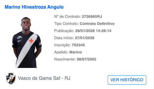 27/01/26 - Documentação de Hinestroza está completa e jogador será registrado nesta 3ª-feira; Vasco aguarda documento da Udinese para registrar Brenner