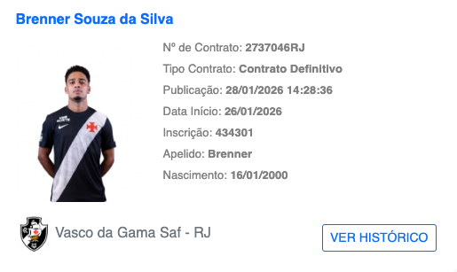 28/01/26 - Brenner usará a camisa 20 do Vasco