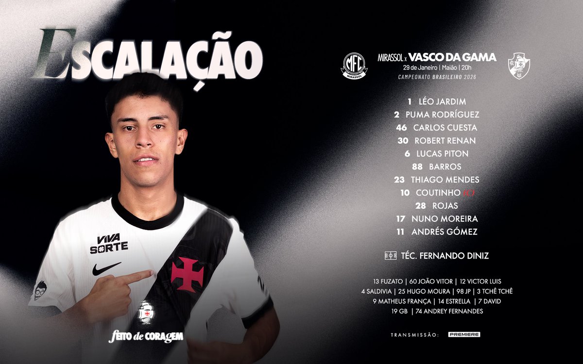 O 𝐕𝐚𝐬𝐜𝐨 𝐝𝐚 𝐆𝐚𝐦𝐚 está escalado para os seus primeiros 90 minutos de Campeonato Brasileiro 2026! 📋💢