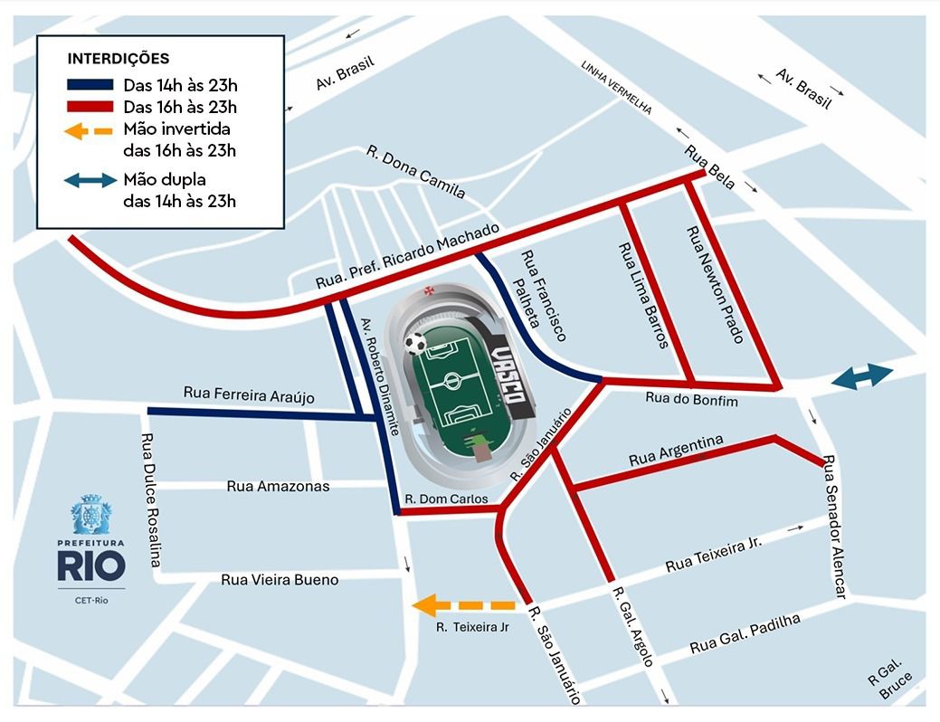 – Rua do Bonfim, no sentido ao Estádio de São Januário, entre a rua Newton Prado e a rua São Januário;