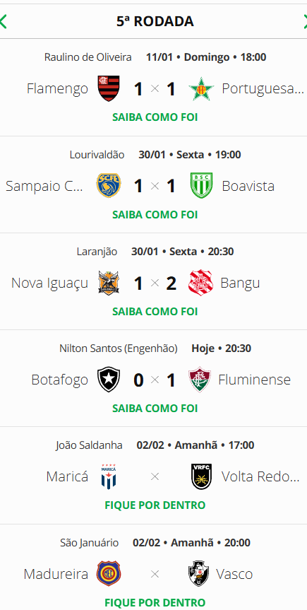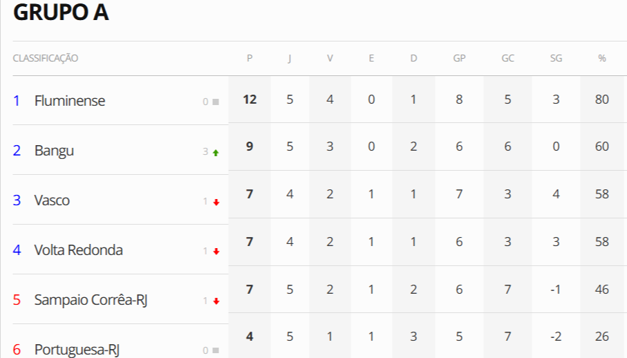 Apenas um jogo deu continudade, neste domingo, à 5ª e penúltima rodada da Taça Guanabara. O Fluminense derrotou o Botafogo e cheou aos 12 pontos no Grupo A. O Gigante da Colina, no entanto, ainda joga na rodada, contra o Madureira, na 2ª-feira, às 20h, em São Januário. Os 4 primeiros colocados de cada grupo avançam às quartas de final; os 2 últimos disputam o quadrangular do rebaixamento.