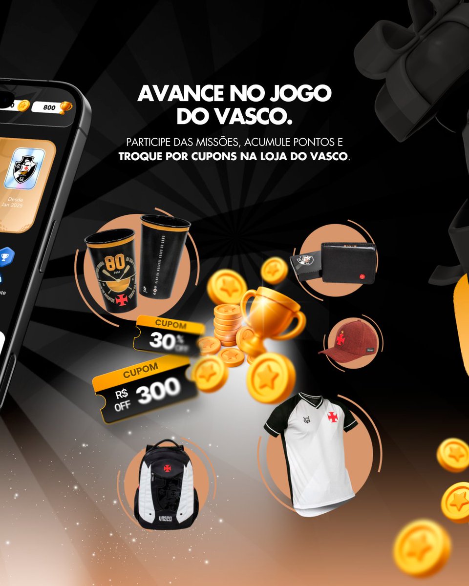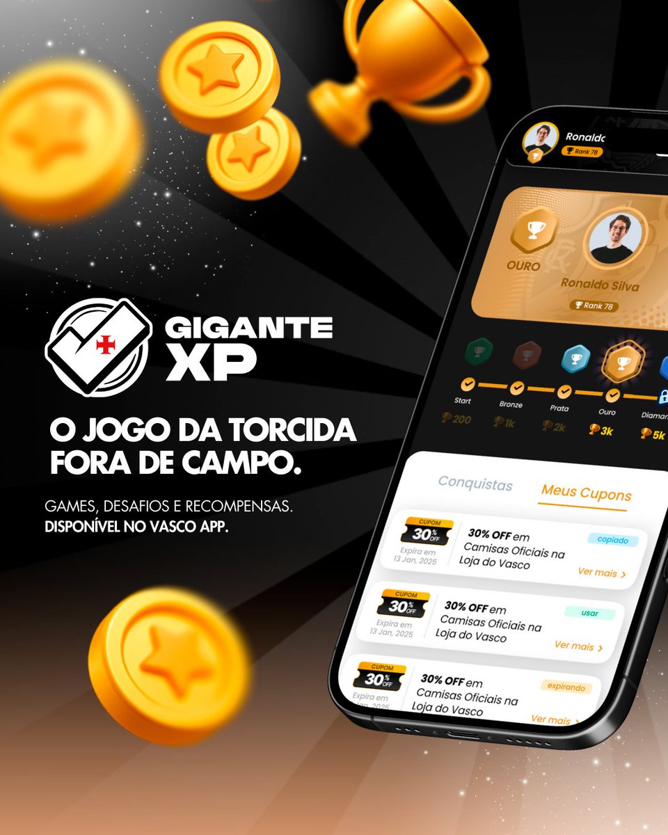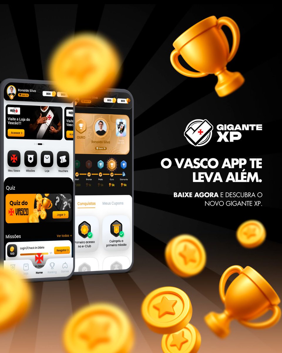 Com o Gigante XP, no Vasco App, a torcida cumpre desafios, soma moedas todos os dias e desbloqueia recompensas exclusivas!