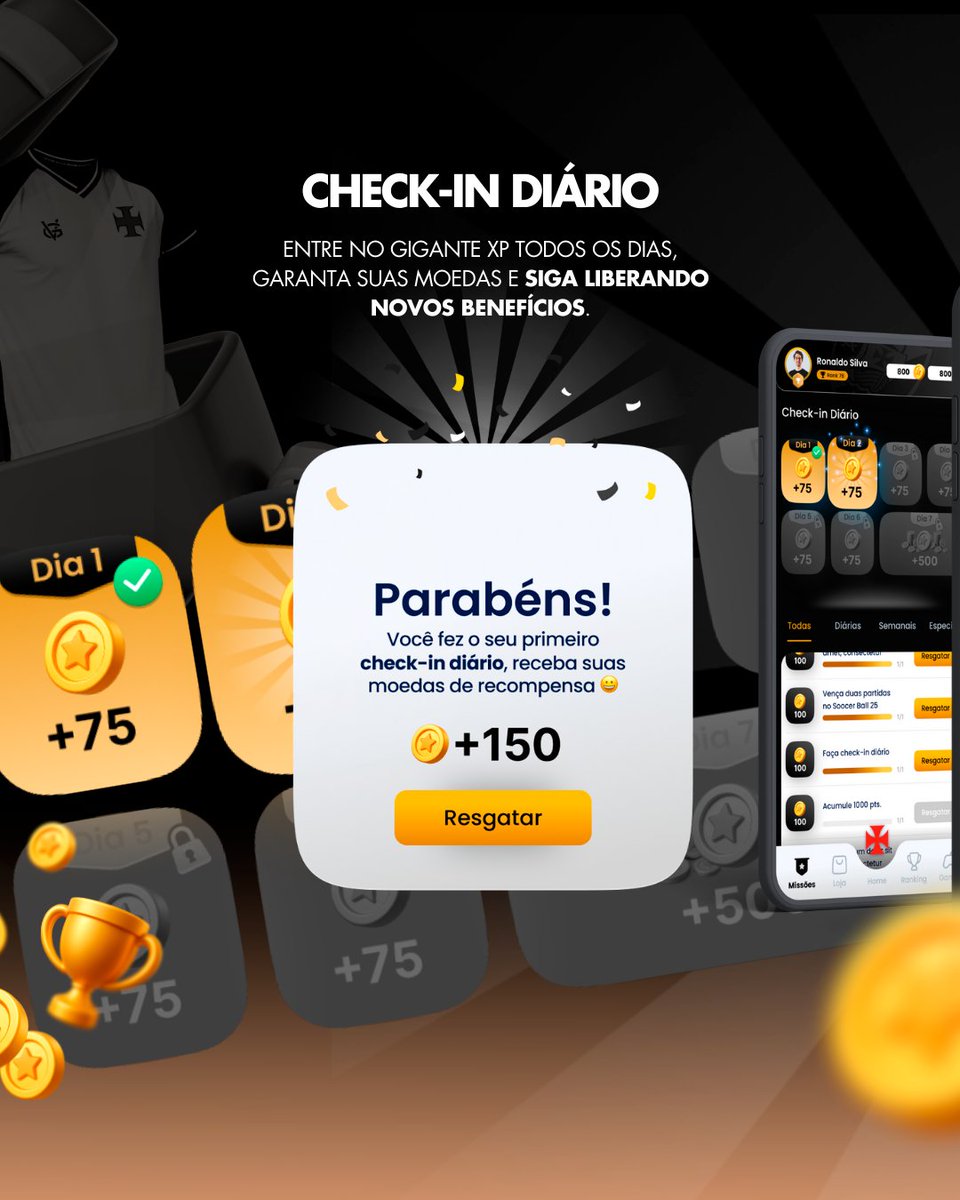 Com o Gigante XP, viver o Vasco vai além da arquibancada. Cumpra missões, avance dia após dia e viva sua paixão em modo recompensa! 📲