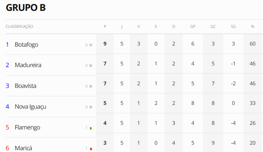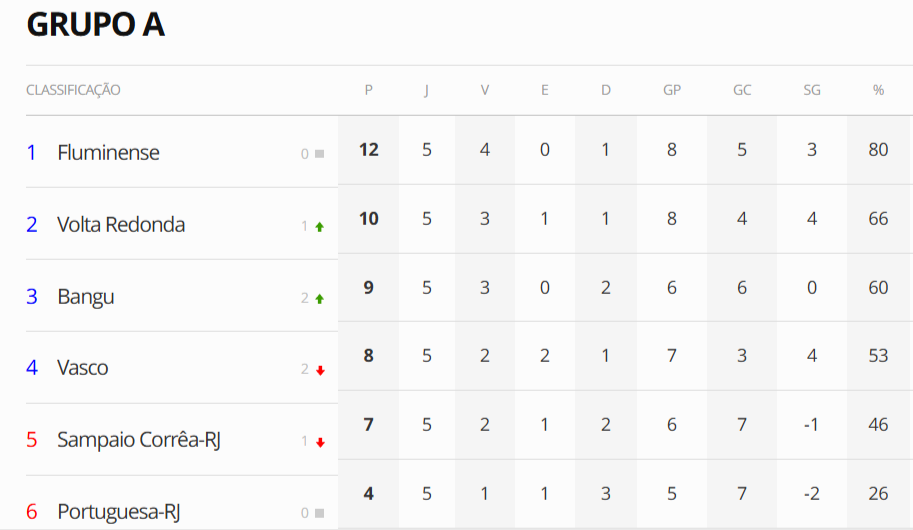 Terminada a 5ª rodada da Taça Guanabara, que equivale à 1ª fase do Campeonato Carioca, o Vasco, que empatou com o Madureira por 0 a 0, caiu da 3ª para a 4ª colocação no Grupo A. Os 4 primeiros colocados de cada grupo avançam às quartas de final; os 2 últimos vão disputar o quadrangular do rebaixamento.