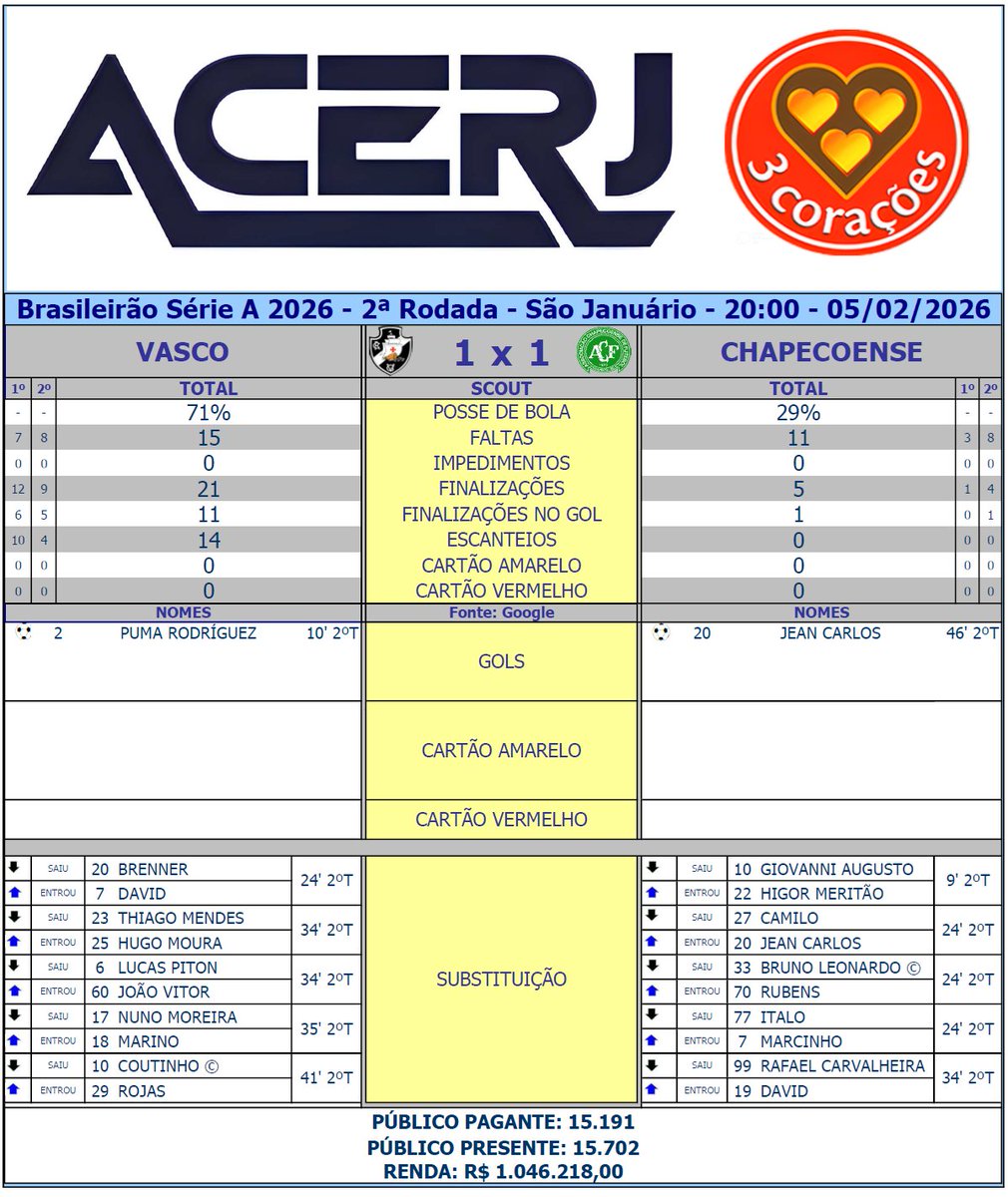 VASCO: Léo Jardim; Puma Rodríguez, Cuesta, Robert Renan e Lucas Piton (João Vitor, 33'/2ºT); Barros, Thiago Mendes (Hugo Moura, 33'/2ºT) e Philippe Coutinho (Johan Rojas, 40'/2ºT); Andrés Gómez, Nuno Moreira (Marino Hinestroza, 33'/2ºT) e Brenner (David, 23'/2ºT). Técnico: Fernando Diniz
