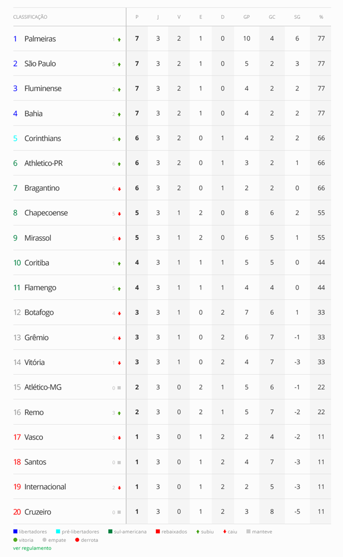 Confira a classificação do Campeonato Brasileiro: