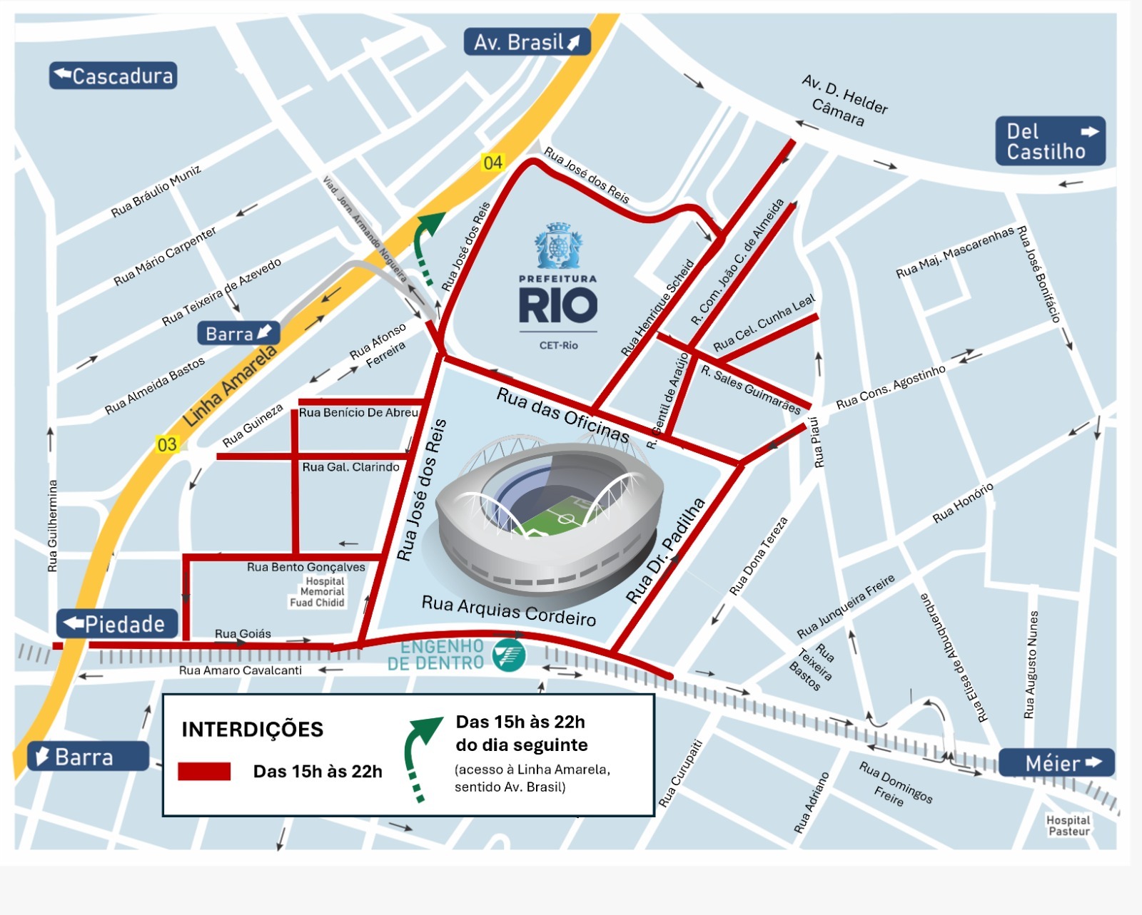 O acesso à Linha Amarela, sentido Avenida Brasil/Fundão, poderá ser realizado pela Rua das Oficinas, a partir do cruzamento com a Rua José dos Reis, sob o viaduto Jornalista Armando Nogueira.