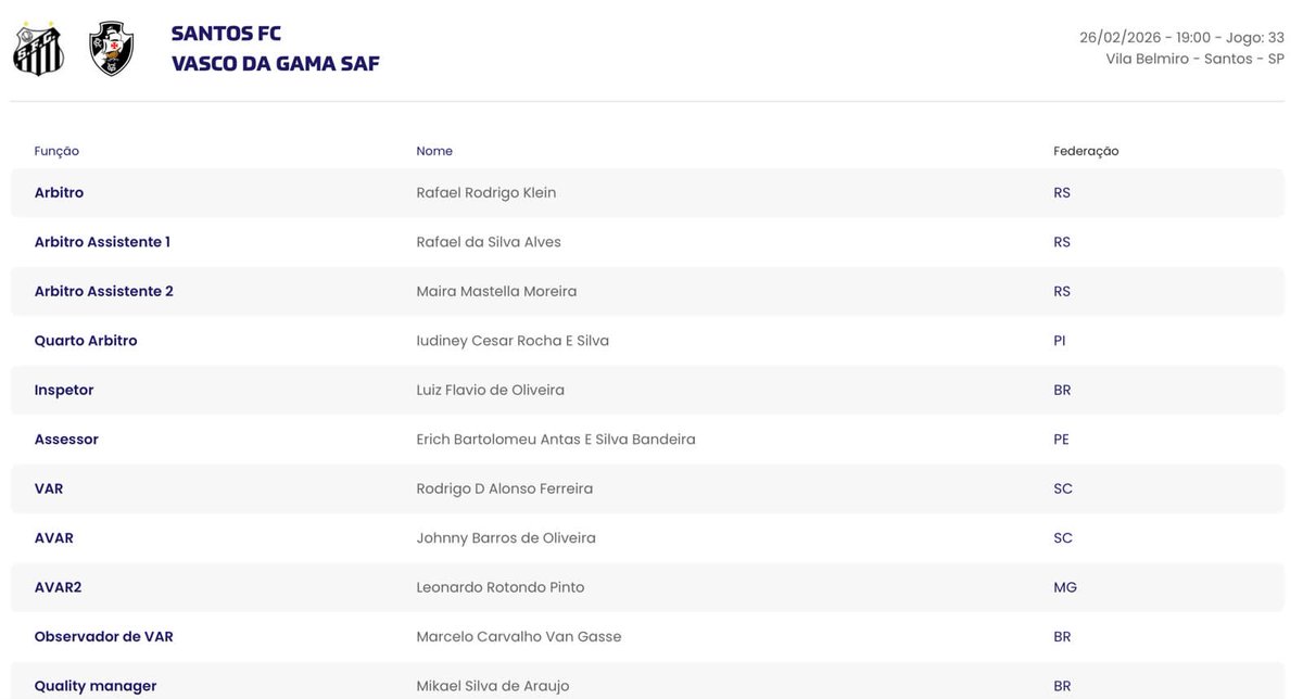 Rafael Rodrigo Klein apita o duelo entre @SantosFC e Vasco nesta quinta-feira, 19h, na Vila Belmiro... #deolhonopeixe