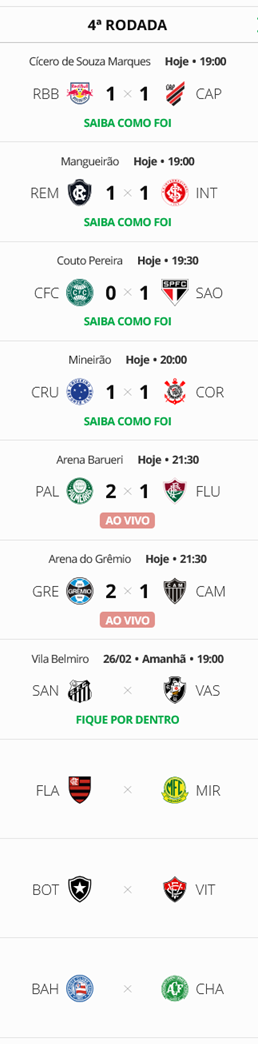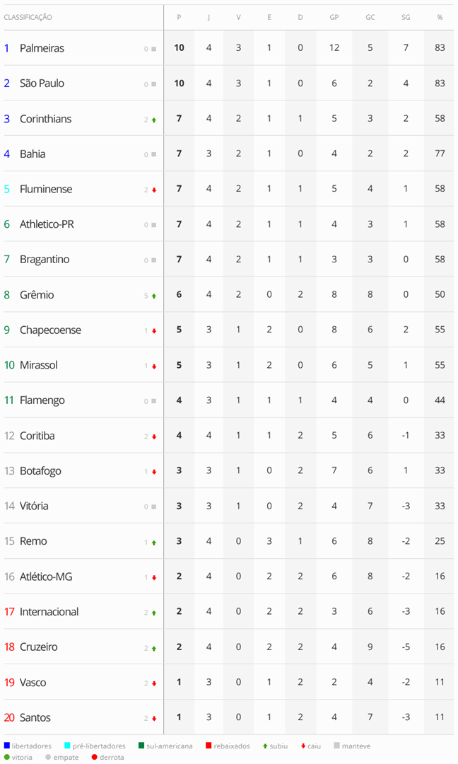 Seis jogos abriram a 4ª rodada do Campeonato Brasileiro nesta 4ª-feira. Os resultados deixaram o Vasco na 19ª e penúltima colocação. O Gigante da Colina enfrenta o Santos nesta 5ª-feira, às 19h, na Vila Belmiro.