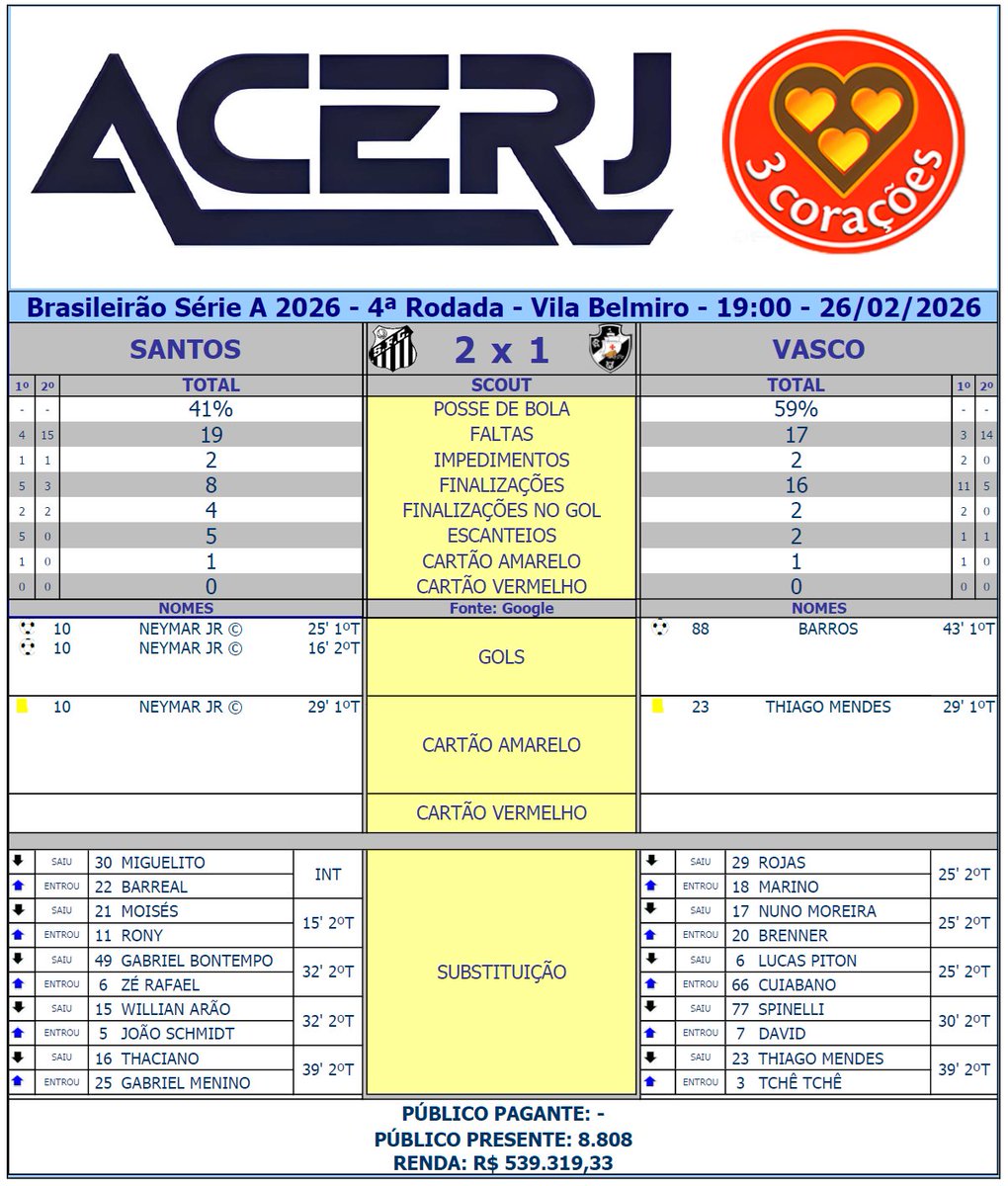 Cartões amarelos: Neymar (SAN) / Thiago Mendes (VAS)