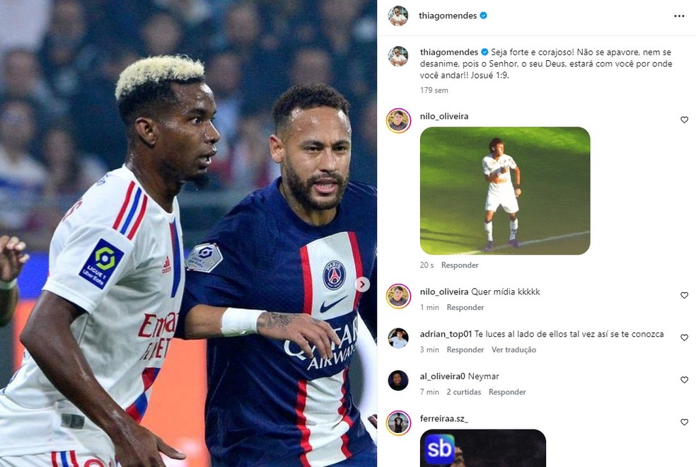 Uma das fotos fixadas de Thiago Mendes é justamente marcando Neymar nos tempos de Lyon e Paris Saint-Germain, quando ambos atuavam no futebol francês. A publicação saiu de 3.000 comentários e está chegando perto das 10 mil interações de usuários.