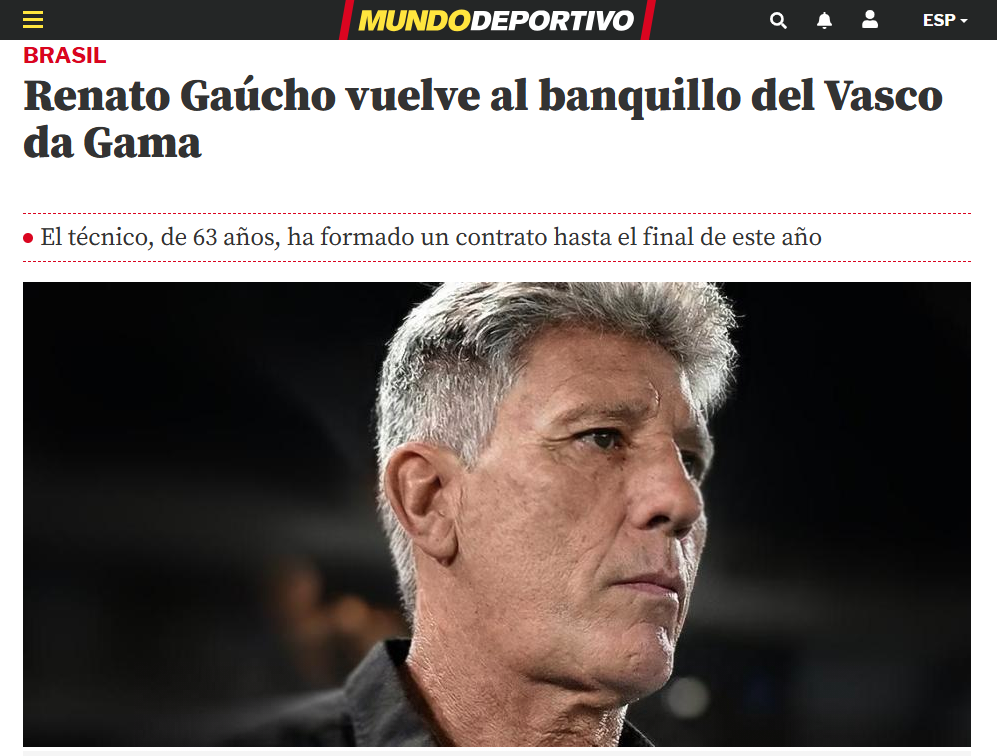 A contratação do treinador Renato Gaúcho pelo Vasco repercutiu na imprensa internacional. Veja alguns exemplos.