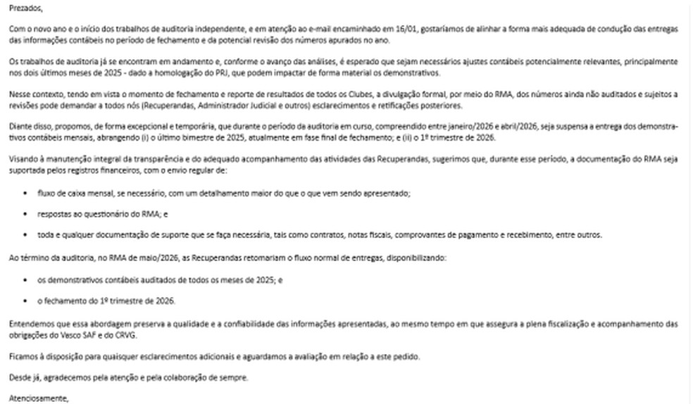 No relatório, o Vasco informa que contratou uma auditoria independente, que já está em curso e abrange o processo de fechamento e revisão dos demonstrativos contábeis, sobretudo para a análise dos últimos meses de 2025.