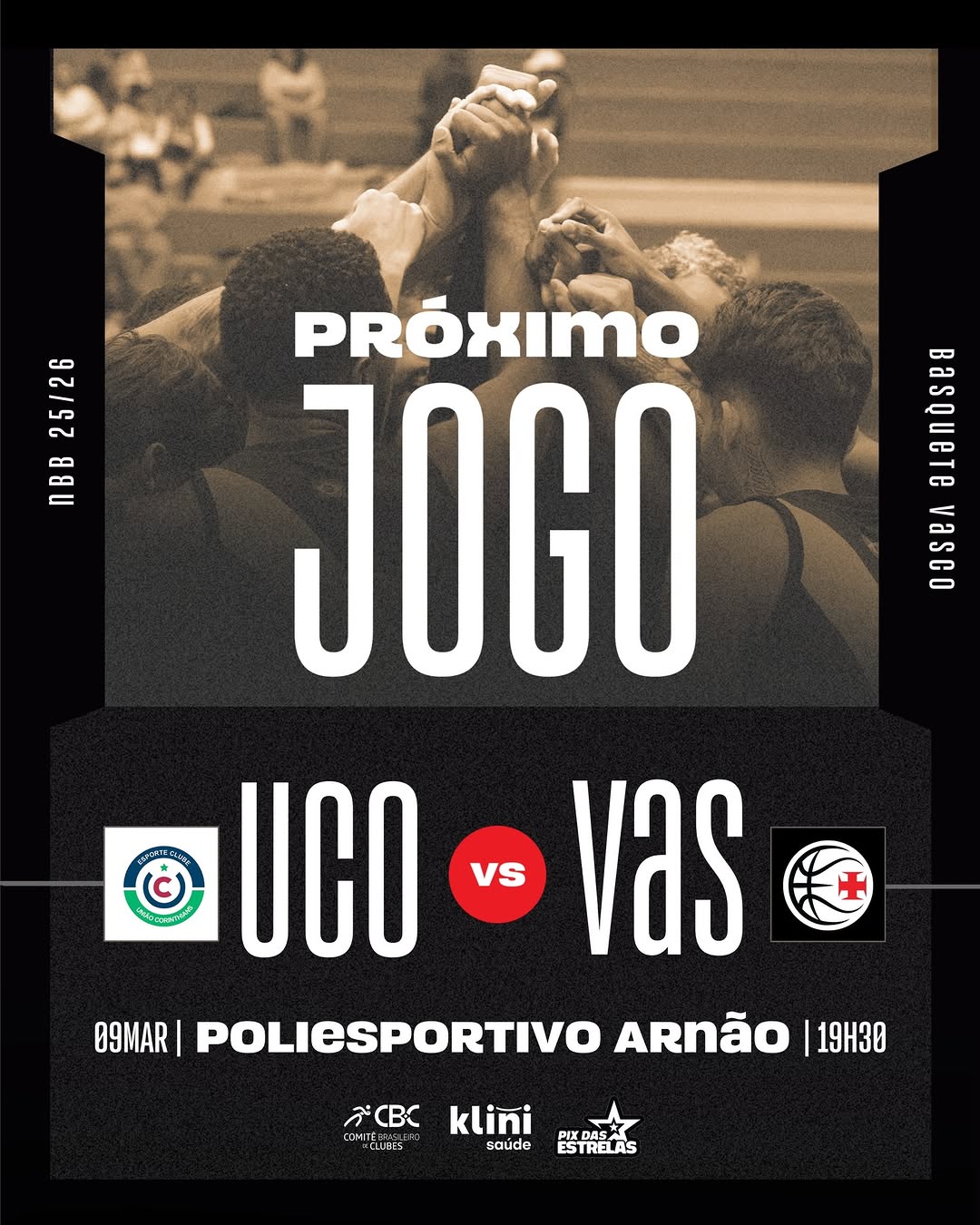 AMANHÃ é dia! 💢🏀 O Vasco da Gama encara o União Corinthians, às 19h30, no Ginásio Poliesportivo Arnão, em Santa Cruz do Sul, por mais um desafio do NBB CAIXA 25/26.